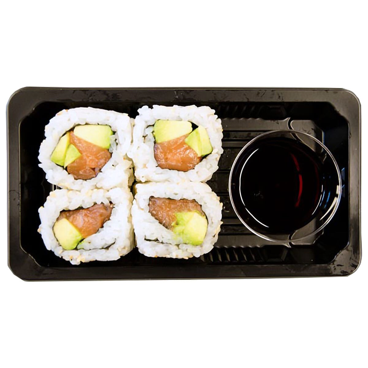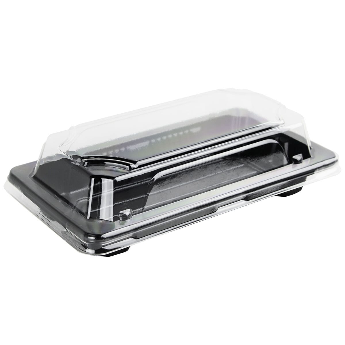 Plastbrett til sushi med lokk, plass til 4-5 biter. Praktisk for take-away og enkel servering.
