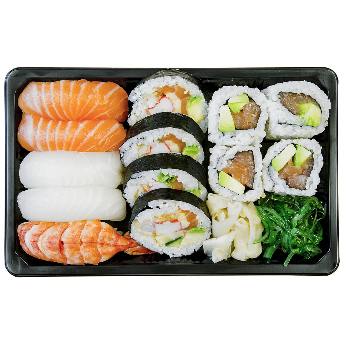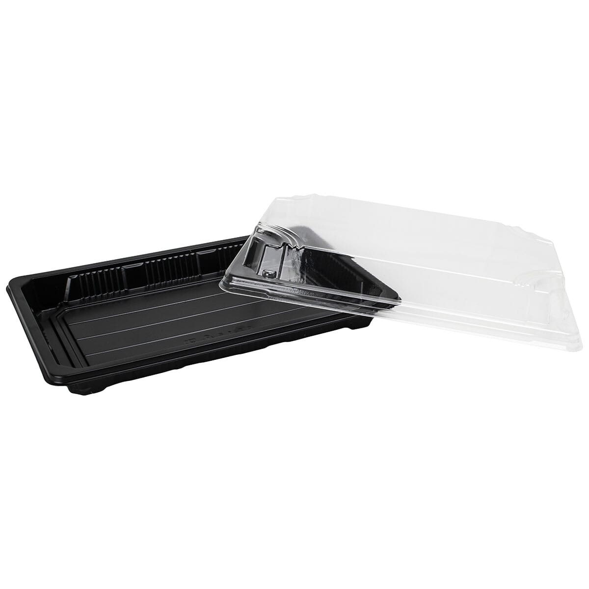 Sort plastbrett til sushi med gjennomsiktig lokk, plass til 12-14 biter. Praktisk for take-away og enkel servering.