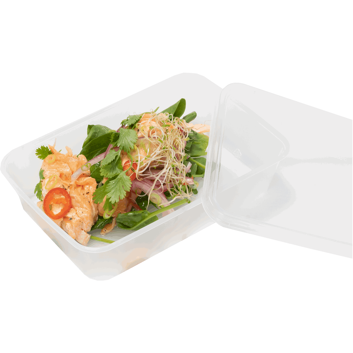 Gjennomsiktig beger med lokk, egnet til servering av varmmat, 500ml. Praktisk for take-away og catering.
