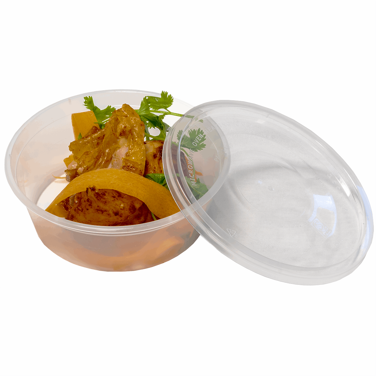 Gjennomsiktig rundt plastbeger med lokk, 280ml. Perfekt for take-away og enkel servering av saus eller små porsjoner med tilbehør.