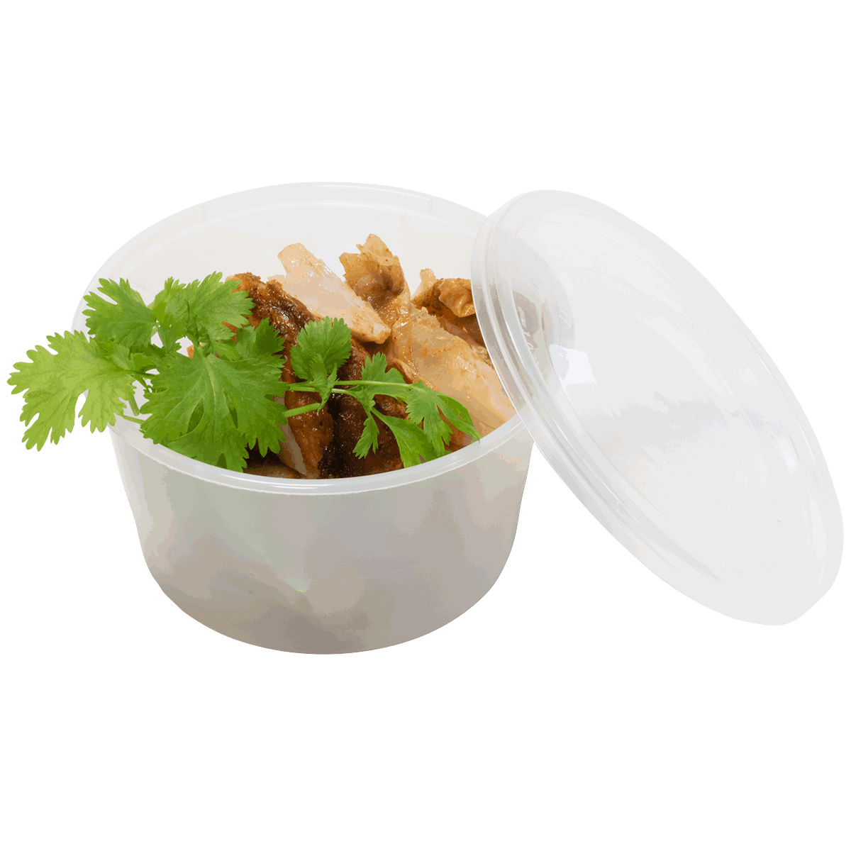 Gjennomsiktig, rundt beger med lokk, 450ml. Egnet til varmretter som suppe og saus.