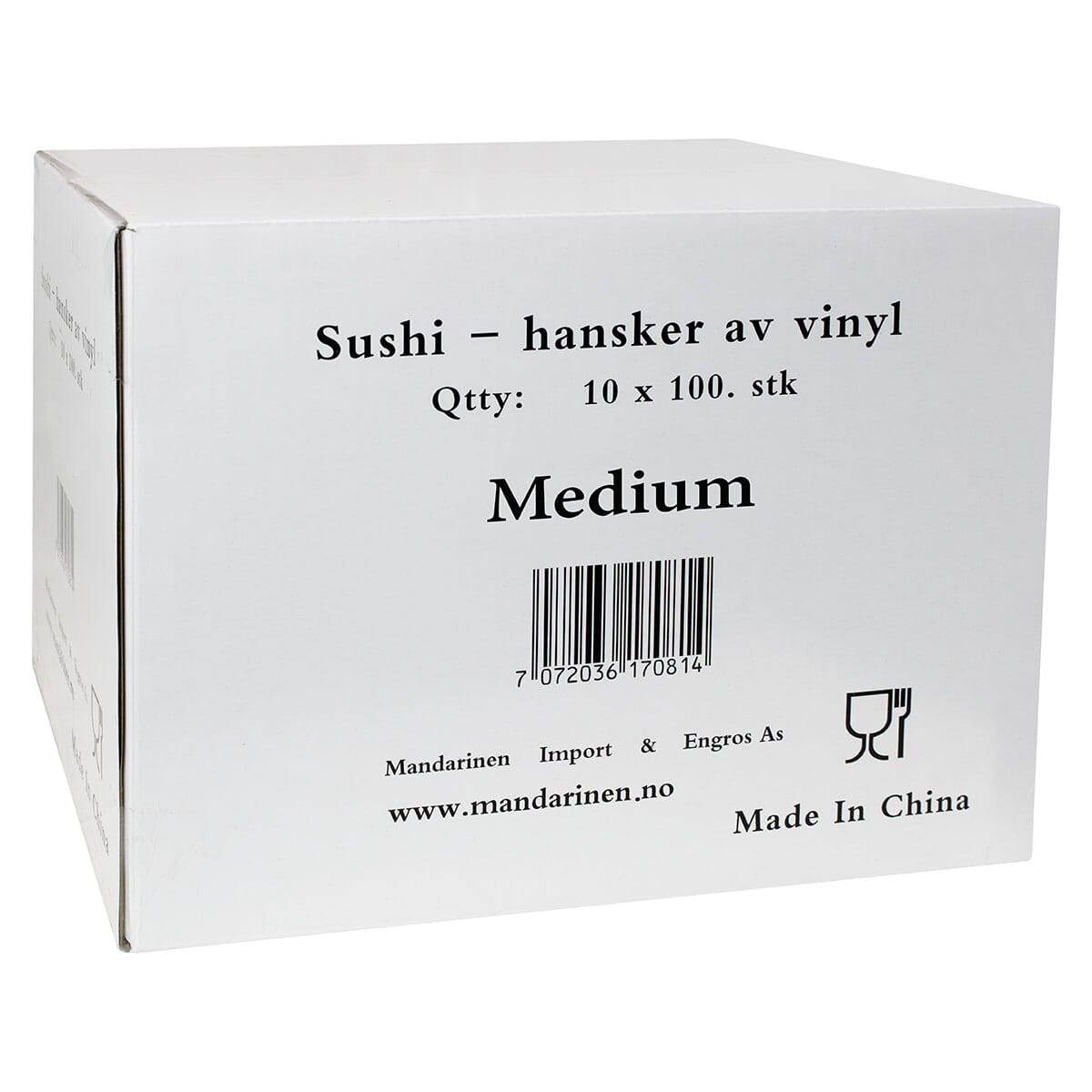 Pudderfri engangshansker laget av vinyl, størrelse M. Passer godt til tilbredning og servering av sushi, og annet mat.