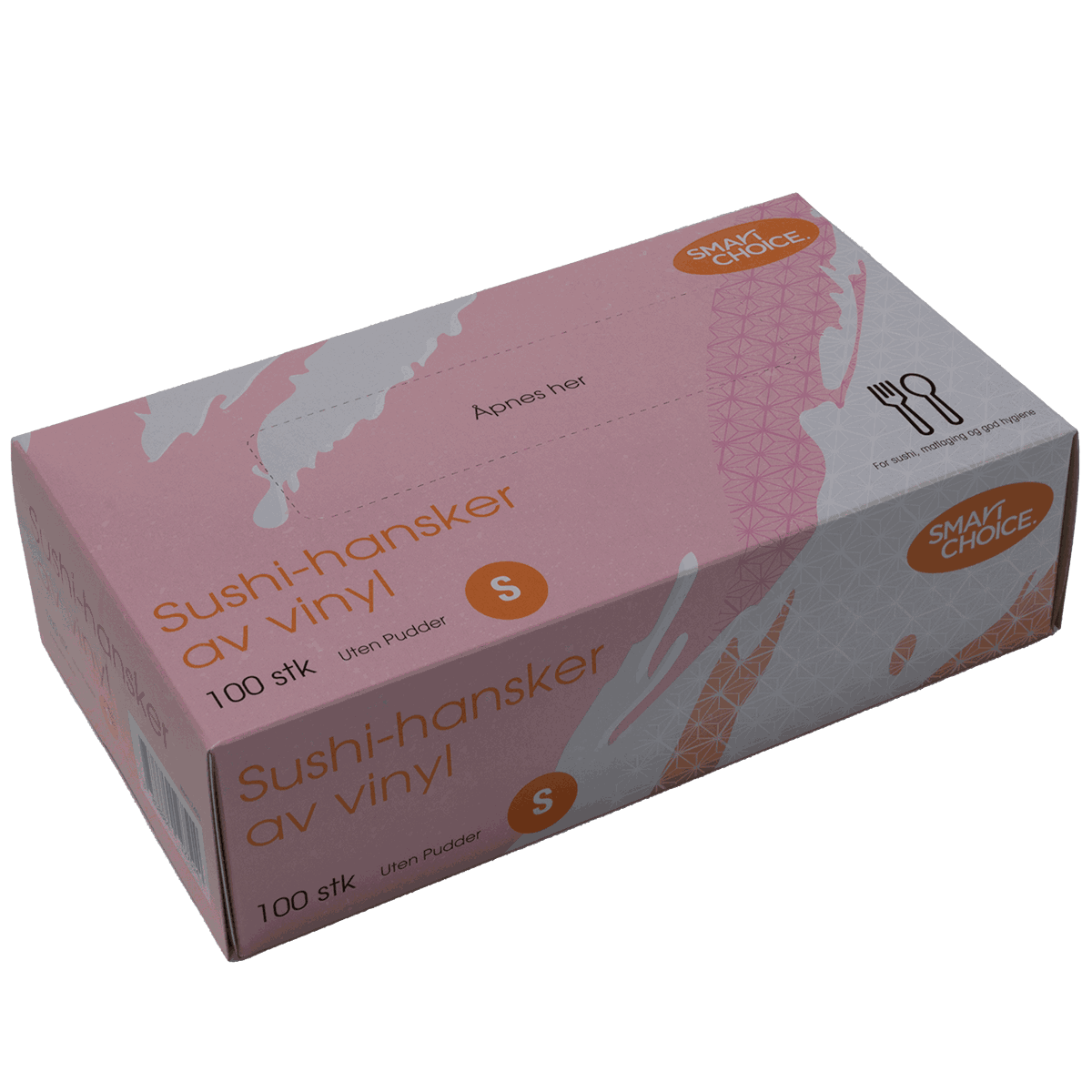 Pudderfrie engangshansker laget av vinyl, størrelse S. Passer godt til tilbredning og servering av sushi, og annen mat.